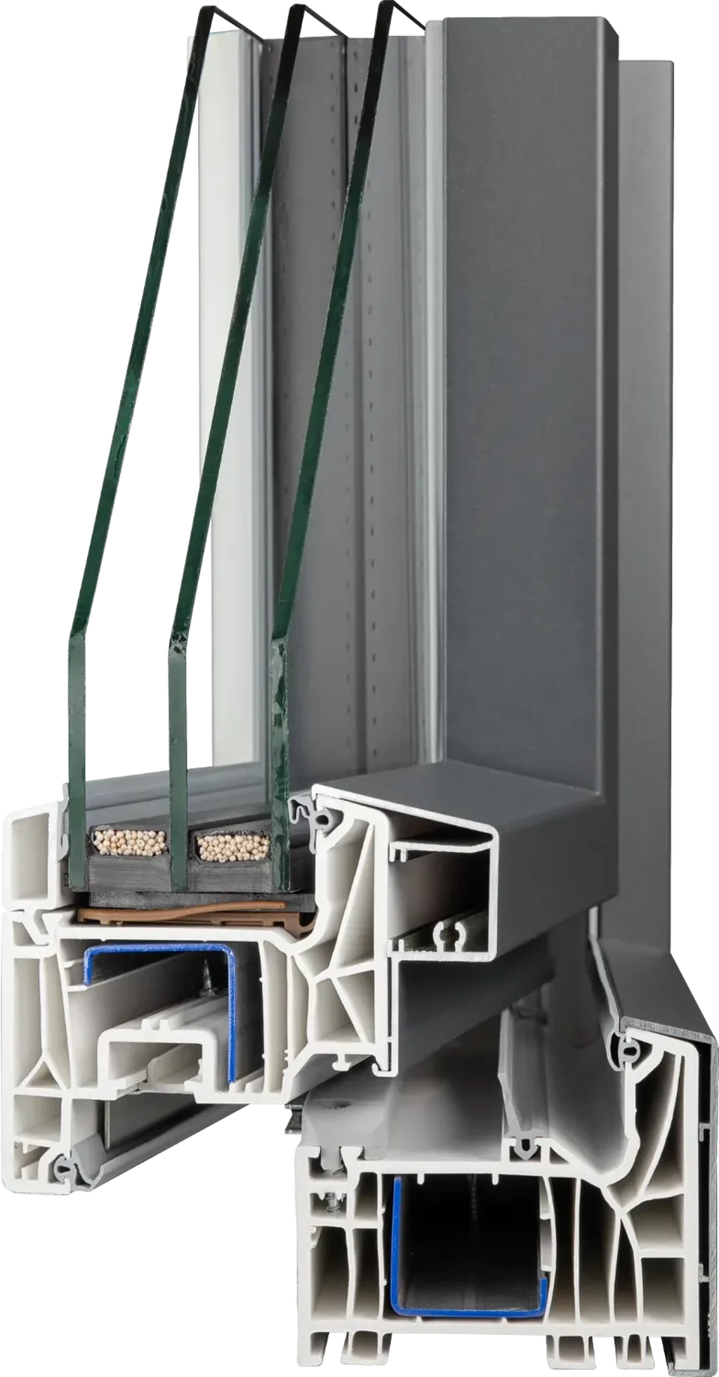 A Schüco Pure a modern, letisztult építészeti stílus és a kimagasló hőszigetelési teljesítmény tökéletes kombinációja. A síkszárnyas kialakítás és az alumínium klipsz borítás elegáns, egységes megjelenést biztosít, miközben extra védelmet nyújt az időjárási hatásokkal szemben. A 82 mm-es, 7 kamrás profilrendszer és a háromszoros EPDM tömítés kiváló hő- és hangszigetelést garantál. Üvegezéstől függően akár Uw = 0,69 W/m²K érték is elérhető, így a rendszer energiatakarékos otthonok ideális választása. A RAL színpaletta széles választékot kínál, strukturált felülettel még egyedibb megjelenés érhető el.