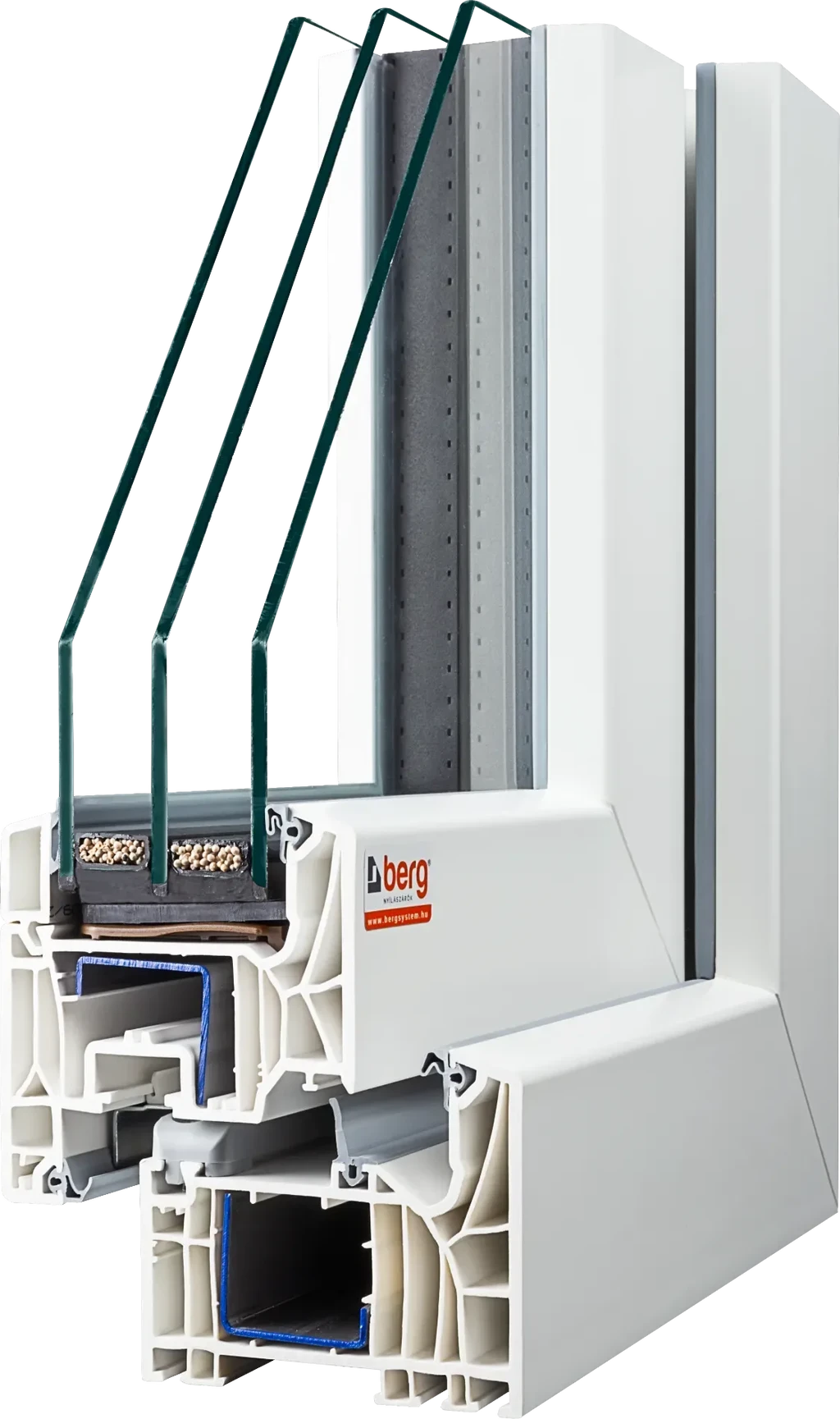 A Berg Trend 82 a Schüco LivIng profiltechnológiára épülő, kimagasló energetikai teljesítményű műanyag ablakrendszer. A 82 mm-es beépítési mélység és a 7 zárt légkamrás kialakítás kiváló hőszigetelést biztosít, míg a háromszoros EPDM tömítési szint magas fokú légzárást és hangszigetelést nyújt. Megfelelő üvegezéssel akár Uw = 0,75 W/m²K érték is elérhető, így a rendszer ideális választás energiatakarékos és korszerű otthonokhoz. Keskeny profilkialakítása maximális fénybeeresztést tesz lehetővé, miközben stabil, biztonságos szerkezetet garantál.